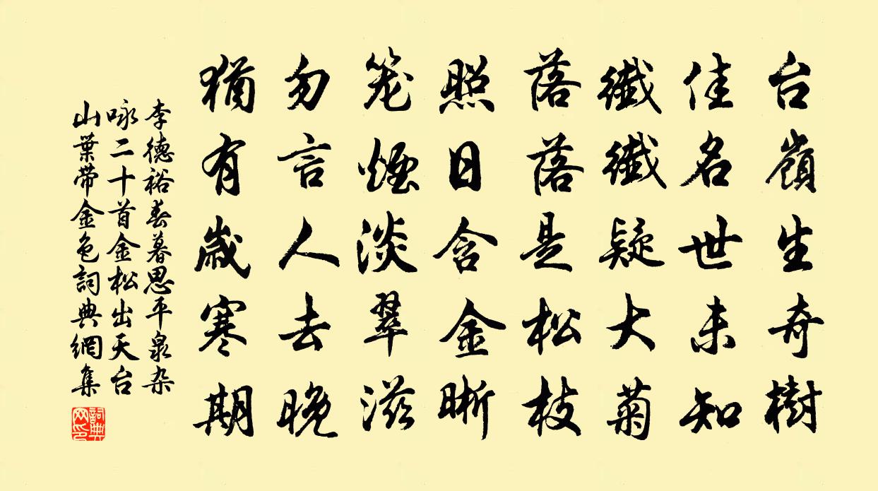 问:《春暮思平泉杂咏二十首。金松(出天台山,叶带金色)》的作者是谁?答:李德裕