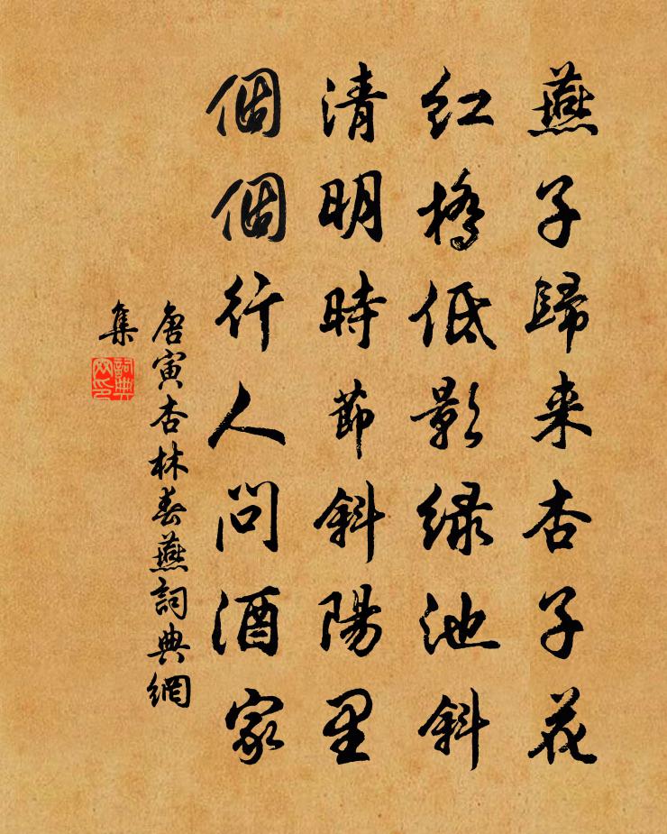 燕子归来杏子花,红桥低影绿池斜。清明时节斜阳里,个个行人问酒家。